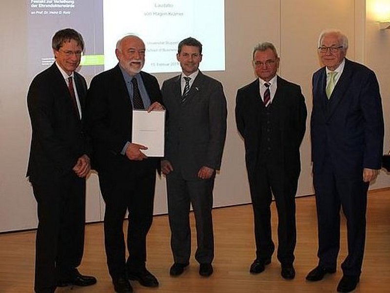 Am 13. Februar 2019 erhielt Prof. Dr. Heinz D. Kurz die Ehrendoktorwürde der Fakultät für Wirtschaftswissenschaft der Bergische Universität Wuppertal. Die Schwerpunkte seiner Tätigkeit in den vergangenen 40 Jahren waren umfangreiche und originelle Untersuchungen zur Geschichte und Entwicklung der ökonomischen Theorien und der ökonomieverbundenen Wissenschaften, mehrfach verbunden mit ausführlichen erkenntniserweiternden Aussagen zu Schumpeter und seinen Forschungen. Zweitens fallen die weltweit verteilten Lehr- und Vortragstätigkeiten und das damit verbundene Netzwerk zur Vermittlung seiner Erkenntnisse zu kritischer Diskussion und zur Aufnahme neuer Sichtweisen auf. Drittens sind die Impulse mit der Übernahme von Funktionen in bestehenden wissenschaftlichen Organisationen, der Schaffung neuer Organisationen und dem Aufbau neuer Veröffentlichungsformate hervorzuheben.