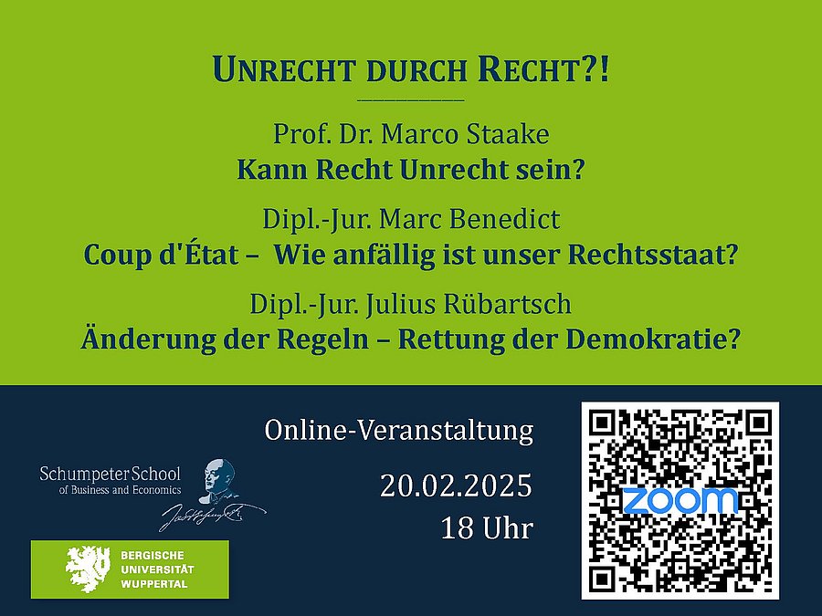Prof. Dr. Marco Staake widmet sich zunächst der Frage, ob Recht Unrecht sein kann. Dipl.-Jur. Marc Benedict nimmt im Anschluss daran die gegenwärtige Verfassungskrise in den USA zum Anlass, um zu untersuchen, wie anfällig unser Rechtsstaat für einen Coup d’État ist. Dipl.-Jur. Julius Rübartsch fragt schließlich, ob es geboten oder problematisch ist, durch Regeländerungen die Demokratie zu retten.